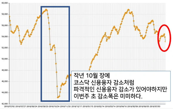 아직도 올해 봄사이에 쌓였던 신용융자 잔고, 특히 코스닥 시장의 신용융자는 아직도 충분히 해소되지 않았습니다.