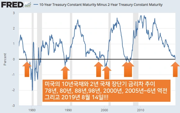 이 역사적인(?) 장단기 금리차 역전 시기를 FRED에서 자료를 받아 위에 도표처럼 화살표로 표시를 해 보았습니다. 이 장단기 금리차가 역전되고 얼마 후엔 회색으로 반전된 공식적인 경기 침체 시기가 발생하였습니다. 그리고 우리 대한민국 입장에서는 그 역전이 발생한 이후 한국에 치명적인 경기침체나 위기가 찾아왔으니 장단기 금리차 역전은 10년 주기 위기설에 결정적인 증거가 되어왔습니다.