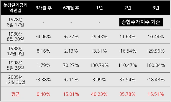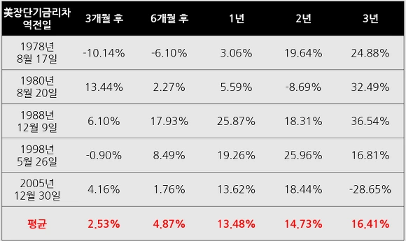 미국 S&P500지수만 보면 무언가 아쉬움이 남지요. 한국 증시와도 비교할 필요가 있어, 위의 자료 중 78년을 제외한 1980년 이후 발생한 4번의 장단기 금리 역전 시점 이후 한국의 종합주가지수의 3개월,6개월, 1년, 2년, 3년 수익률을 비교하여보았습니다.