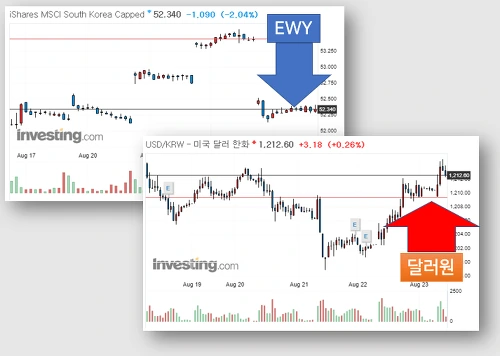 [밤사이 달러원 환률은 속등하였고 EWY 한국ETF가격은 급락하였다]