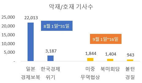 8월 한달에만 "일본 경제보복" 키워드로 쏟아낸 악재성 뉴스기사수가 2만2천여건에 이를 정도였습니다. 지난 8월 한달 하루에도 수백 수천건씩 일본경제보복 관련 뉴스기사가 쏟아졌던 것입니다.