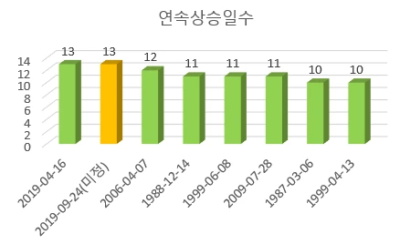 현재 글을 쓰고 있는 9월 24일 점심 즈음은 한참 증시가 열려있는 시간이기 때문에 13거래일 연속 상승이 확정되지는 않았습니다. 그래도 꿈틀꿈틀 움직이는 흐름에서 13거래일 연속 상승 타이 기록이 세워질 것이라는 기대를 가져 보게 합니다. 이미 12거래일 연속이라는 증시를 새롭게 보는 기록은 착착 쌓아올라왔기 때문이지요.