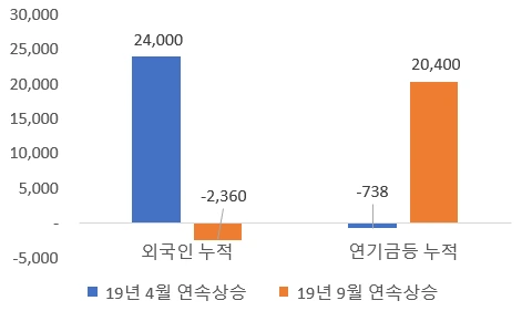[19년 4월 연속상승 시기와 9월 연속상승 시기에 외국인과 연기금의 누적매매추이]