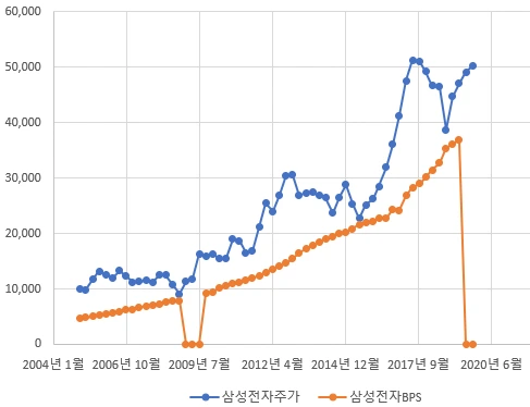 위의 표는 삼성전자의 주가와 삼성전자BPS추이를 한 차트에 그려본 자료입니다.
