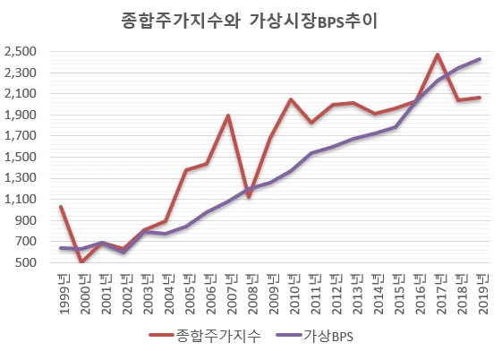 앞서 비유드린 산책나온 강아지처럼 주인에게서 멀리 떨어진듯 하지만 결국 주인을 따라 움직이는 것처럼 말입니다. 그런데, 위의 표에서 재미있는 부분을 찾아볼 수 있습니다. 바로 (가상)시장BPS가 매우 꾸준히 우상향하고 있다는 점입니다.