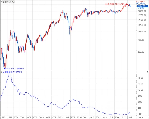 2000년 초반만 하더라도 하루 등락률이 5~10%에 이르던 일이 비일비재했던 것과 비교하면 2010년대 증시는 너무도 고요했습니다. 2000년 초반 증시를 바다에서 큰 파도타기와 같다면, 2010년대 증시는 연못에서 헤엄치는 것과 같을 정도입니다.