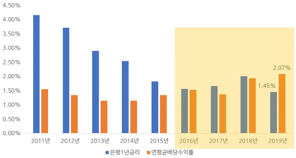 [2010년대 들어 은행이자율에 비해 배당수익률의 메리트는 높아지고]