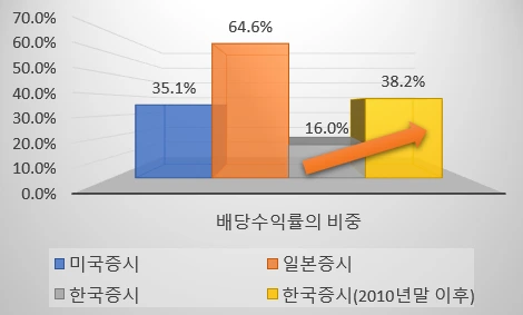 위의 표를 보시면 2000년 이후 총투자수익률(배당+시세차익)에서 배당이 차지하는 비중은 미국은 35%, 일본은 64.6%로 매우 높은 비율임을 확인할 수 있습니다. 한국은 2000년 이후부터 계산하여보면 16%로 낮은 수준입니다만, 2010년말 이후 즉 2010년대로 계산하면 38.2%로 총투자수익률에서 배당수익률이 차지하는 비중이 높아졌습니다.