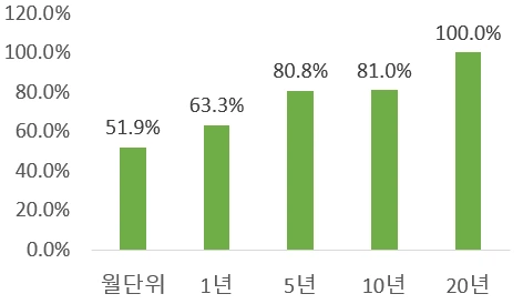 월단위로 수익률을 체크할 경우 수익을 본 비율은 52%수준입니다. 거의 홀짝놀이 수준이지요. 하지만 시간의 관점을 넓혀 1년으로만 키워도 수익을 본 비율은 63%로 높아지고 5년,10년으로 시간의 범위를 넓히게 되면 80%대로 급격히 높아집니다.
