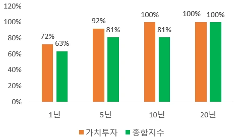 위의 자료에서 보시는 바처럼 종합주가지수는 1년 단위 관점에서는 63%의 수익을 만든 비율을 보여주었습니다만, 가치투자 방식은 72%라는 높은 가능성을 보여주었고, 5년 관점에서는 가치투자 방식의 수익을 본 비율이 92%로 급격히 높아지며 주가지수는 20년 단위에서야 도달한 100% 수익비율이 가치투자 방식은 이미 10년 단위에서 100% 수익 확률에 이르게 됩니다.