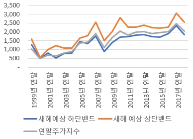 그 해 증시가 강세장이었다면 살짝 밴드 상하단이 올라가는 경향이 있을 것이고 증시가 약세장이었다면 지수 밴드 예측치 상단이 과하게 올라가지 않거나 하단이 낮아지는 경향이 나타납니다.