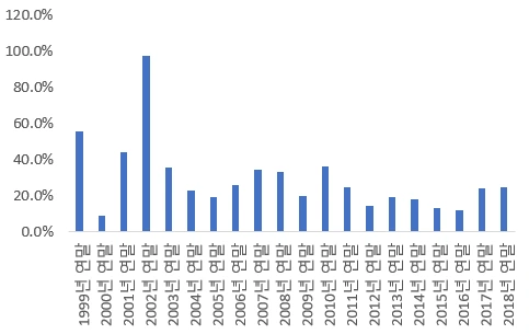 앞서 지수전망치 밴드상단비율이 그 전년도보다 증가/감소하면 역발상적으로 새해증시를 해석할 수 있다고 말씀드렸습니다. 그런데 아무런 근거없이 말씀드리면 어거지 논리가 될 수 있기에 1999년 연말부터 2018년 연말까지 밴드상단비율 전년 대비 증가/감소와 함께 다음해(새해) 주가지수 등락 결과를 20여년간 추적하여보았습니다.