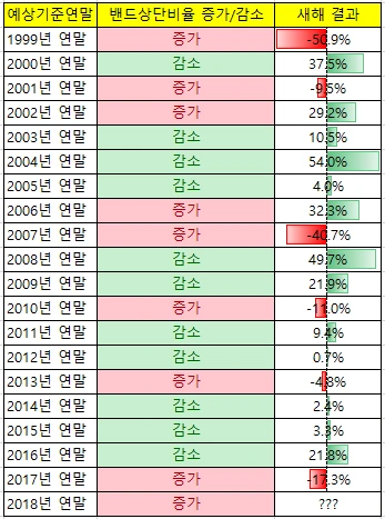 위의 표를 보시면 왠지 모르게 컬러가 딱딱 맞아떨어지는 것을 한눈에 보실 수 있습니다. 밴드 상단비율이 전년도에 비해 증가했을 경우 새해 증시는 하락(빨간색, 아메리칸 스타일로...)하였고 밴드 상단비율이 전년도에 비해 감소하였을 경우 새해 증시는 상승(파란색, 미국식으로)하였습니다.