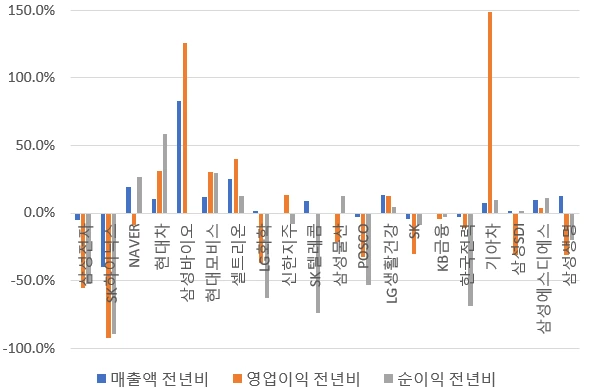 [코스피 시총 20위 기업들의 3분기 전년대비 실적]