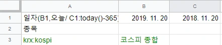 B3셀의 코스피종합은 구글파이낸스에서는 아무의미없는 저만 알아보기 위해 적어놓은 것입니다.