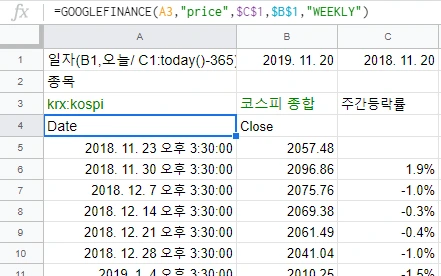 이렇게 하신 후 A4셀에서 =GOOGLEFINANCE(A3,"price",$C$1,$B$1,"WEEKLY")