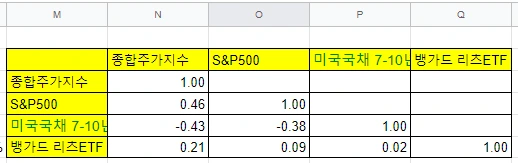 이를 활용하여 종합주가지수와 S&P500지수 그리고 미국국채7-10년ETF 및 뱅가드리츠ETF 들의 각각의 상관계수를 구할 수 있습니다.