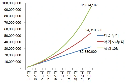 10% 복리로 수익률을 올렸을 경우에는 9400여만원이 됩니다.