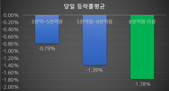 호기심이 생겨 2010년대 들어 외국인이 3천억원 이상 하루 순매도가 발생하였을 때를 당일 매도 규모를 3천~5천억원, 5천억원~8천억원, 8천억원 이상 3그룹으로 나누어 그 날짜의 평균 등락률을 조사하여보았습니다.