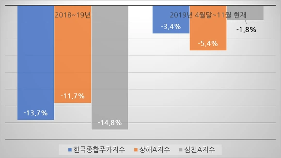 2018년과 2019년 현재까지 2년간 종합주가지수는 MSCI EM에 비중이 높아지는 상해A지수, 심천A지수와 비슷한 수준의 하락률을 보였습니다. 특히나 올해 MSCI 리밸런싱이 진행된 4월말에서 11월 말인 오늘까지 등락률 또한 중국증시에 비해 충격이 있다하기 애매한 수준입니다.