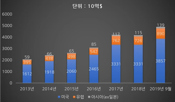 위의 표에서 보시는바처럼 글로벌ETF자산(ex japan)의 규모는 2013년 2조660억$에서 2018년에는 4조1720억달러까지 5년만에 2배이상 커졌고(대략 연 15% 성장률), 올해 9월에는 4조8860조$까지 성장하였습니다. (참고 : 전세계 상위 20개 증권거래소의 시가총액 78.8조$)