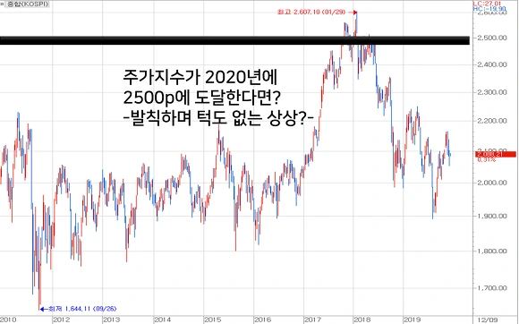 지금 증시 상황에서는 턱도 없는 발칙한 상상입니다만, 만약 내년, 2020년에 주가지수가 2500p에 이른다면 어떤 상황들이 나타날지 하나씩 상상 해 보았습니다. 일단 수치측면에서 보겠습니다.