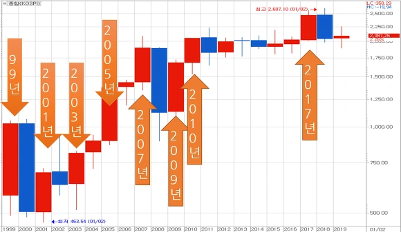 [99년 이후 현재까지 주가지수가 20%이상 상승한 해는 8번]
