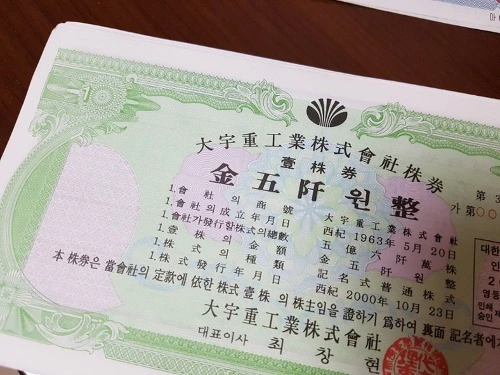 그 무너지는 과정을 필자는 1999년 중순 대우채 사태를 통해 목도하였습니다. 그리고 2001년 (주)대우가 상장폐지를 앞두고 있던 시점에는 한국경제에 큰 역사인 대우 주식은 큰 의미가 있겠다싶어, (주)대우와 (주)대우중공업 주식을 각각 10원에 100주를 매입한 후 현물로 인출하며 대우그룹의 끝자락을 아쉽게 바라보았습니다.