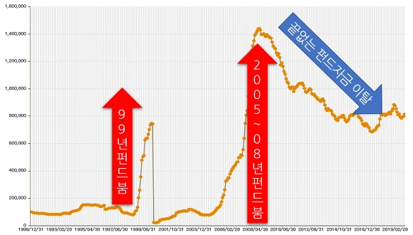 여기서 잠깐 과거 펀드 붐과 이탈하던 때의 초장기 시계열에서의 통계를 살펴보겠습니다.