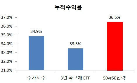 주가지수는 이 기간 34.9%라는 누적성과를 만들었고 3년 국고채 ETF는 33.5%의 누적성과를 기록하였습니다. 서로 비슷비슷하였군요.