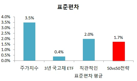 2009년 말부터 최근까지 종합주가지수와 3년 국고채 관련ETF의 월간 수익률의 표준편차는 각각 주가지수 3.5%, 그리고 3년 국고채 관련 ETF는 0.4%로 계산됩니다. 그런데 50vs50 전략을 사용한 자산 포트폴리오의 표준편차는 1.7%로 계산됩니다.