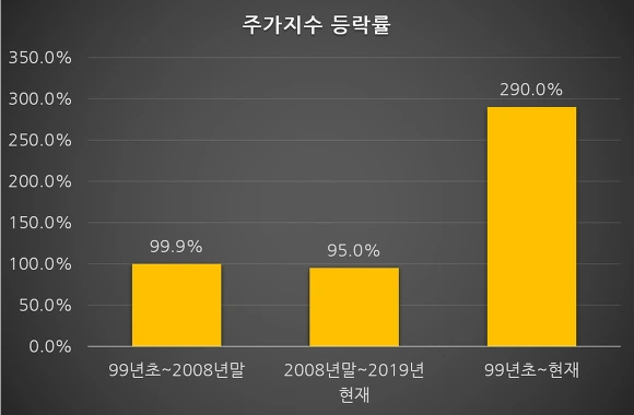 2008년 연말부터 2019년 현재까지 거의 11년의 시간 동안 종합주가지수는 95%상승하였지요.