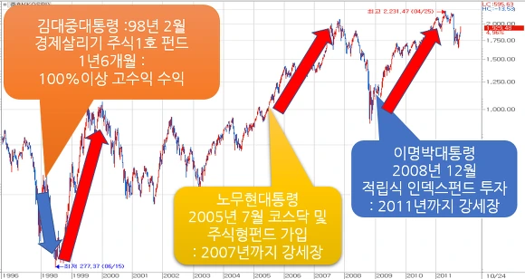 IMF사태 직후인 1998년 김대중 대통령께서 경제살리기 펀드에 가입하신 이후 증시는 크게 폭등하였었고 당시 분석기사에 따르면 100%이상의 고수익을 거둔 것으로 알려져 있습니다.