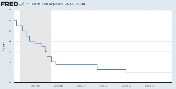 당시 2001년 911테러 이후 초저금리를 이어가던 연준은 2002년~2003년 사이 이라크 전쟁으로 인한 우려감이 커지면서 금리를 파격적으로 인하하였습니다.