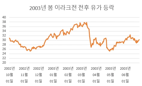 첫번째 사례로 위의 2003년 이라크전 전후의 유가 흐름입니다.