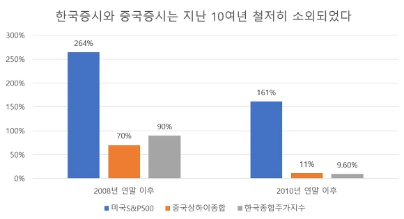 중국증시와 한국증시는 2008년 금융위기 이후 지난 십수년간, 미국증시가 승승장구할 때 상대적으로 뒤쳐진 성과를 만들었습니다.