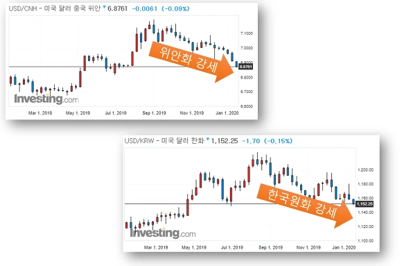 이런 매수세가 나타난 이유에는 미중 무역협상 1단계 합의 기대감이 존재하지만 이와 더불어 동아시아권에서의 달러가치 하락 반대로 중국 위안화 강세와 한국 원화 강세가 발생했기 때문입니다.