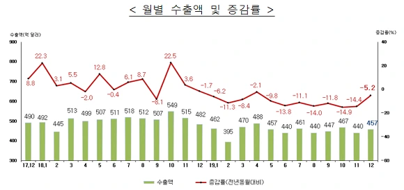 위의 월별 수출액 전년 동기비 증감률 추이를 보시면 미중 무역전쟁이 심화된 2019년들어 수출감소폭이 커지기 시작하였고, 여름부터는 2자리수 수출감소가 매달 발생하였습니다. 그런데 12월 수출은 -5.2%감소하며 감소폭이 크게 줄어들었고 턴어라운드 되는 과정으로 변하기 시작하였습니다.