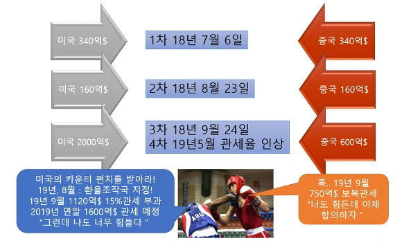 그후 9월에 미국이 중국 제품 1120억$ 규모에 15%관세를 부과하고 중국은 미국산 제품 750억$에 5~10%보복관세를 부과하면서 서로간의 마지막 주먹질은 일단락됩니다.