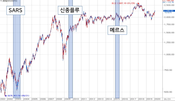 2002년~2003년 SARS 때에는 SARS로 인한 증시 급등락이라는 볼 수 없습니다. 그 즈음 미국의 이라크전쟁 준비가 있었기 때문이지요. SARS가 간간히 투자심리에 악영향을 주기는 하였지만 그 자체가 증시 악재라고는 할 수 없었습니다.
