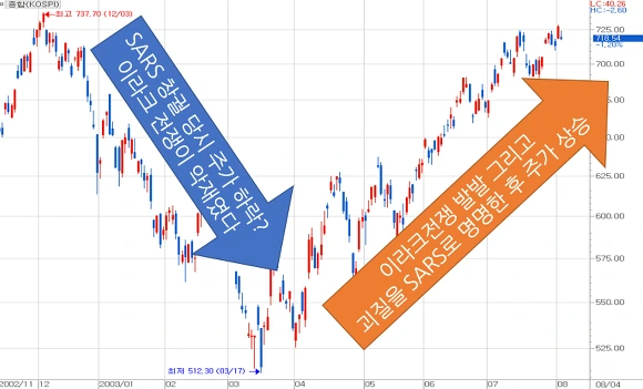 과연 그럴까요? 아니지요. 그 당시는 미국이 이라크전쟁을 앞두고 있던 전쟁리스크가 지배하던 시기였기에 증시 조정세가 깊이 전개되었던 것입니다. SARS는 그저 분위기만 잡았을 뿐이지요.