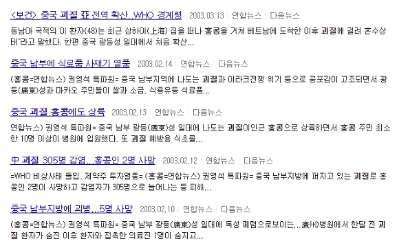 [2003년 SARS가 당시 뉴스들을 보면 현재 우한폐렴에 대한 반응과 똑같다, 자료참조 : 다음뉴스 검색]