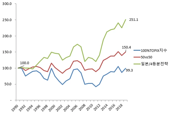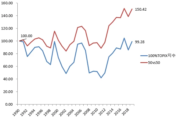 [1990년 기준가 100으로 시작한 TOPIX지수와 50vs50전략]
