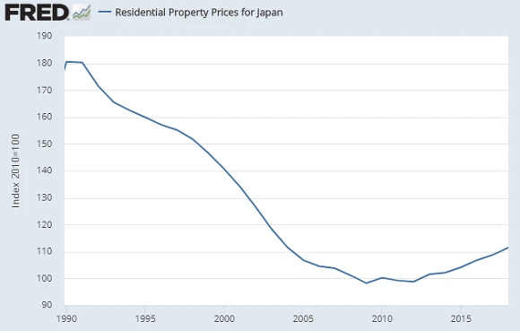 [일본의 주택가격지수 1990년에서 2018년, 자료참조 : FRED]