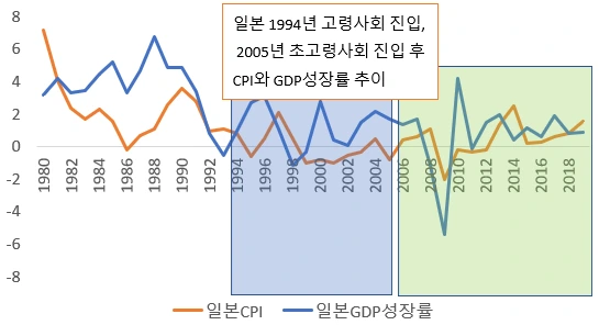 [일본 고령사회 및 초고령사회를 거치면서 경제성장률과 물가상승률이 사라져 갔다]