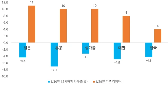 [1월 20일 종가 이후 1월 30일 오늘 12시까지의 주요 아시아 증시 등락률과 29일 기준 감염자수]