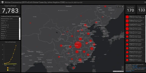 [사진 : 존스홉킨스대 시스템과학공학의 코로나 바이러스맵, 좌측하단 감염자수 급증이 보인다]