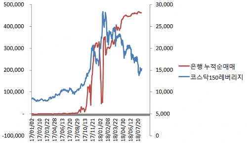 위의 표는 코스닥의 대표적인 레버리지 ETF인 KODEX 코스닥 150 레버리지 ETF의 가격 추이와 이 종목에 대한 은행의 누적 순매매 추이입니다. 자료에서 보시는 바와 같이 작년 2017년 9월 이후 은행은 매우 강력하게 코스닥 레버리지 ETF를 매수하면서 순식간에 4천억원 대 순매수를 만들었습니다. 이 과정에서 코스닥150지수의 폭등과 함께 코스닥150레버리지ETF 가격 또한 크게 상승하게 됩니다. 그리고 그 은행권의 누적 순매매는 봄까지 이어지면서 4천억원대 후반까지 올라섭니다.