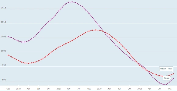 [OECD 경기 선행지수 추이, 한국 보라색선/OECD전체 적색선, 자료참조 : OECD DATA]