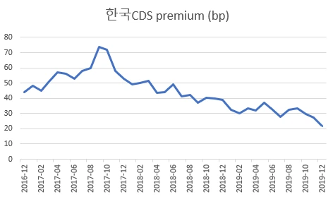 [한국의 CDS프리미엄은 글로벌 금융위기 이후 최저치 기록, 자료참조 : 기획재정부/국제금융센터]